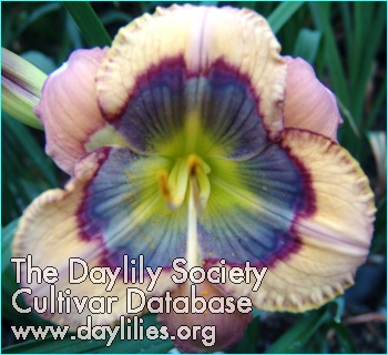 | Description : cream pink reverse bicolor with charcoal light blue lavender purple maroon patterned eye above very green throat | |