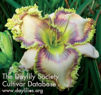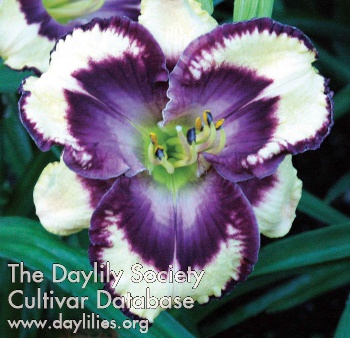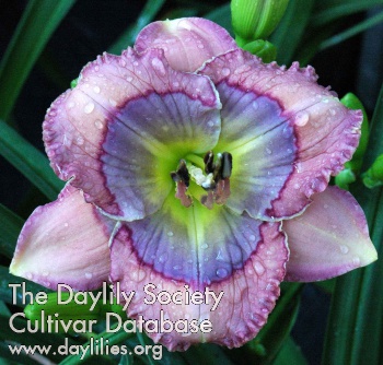| Description : misty rose with a large lawngreen throat, pattern eye is slate blue surrounded by a purple mascara band, eye continues around the petal edges as a matching picotee, surrounded by a bright yellow edge | |