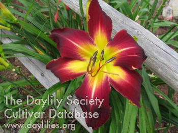 | Description : dark wine purple with a green yellow throat extending out on petals and sepals and surrounded by a chalky lavender halo narrow white midribs | |