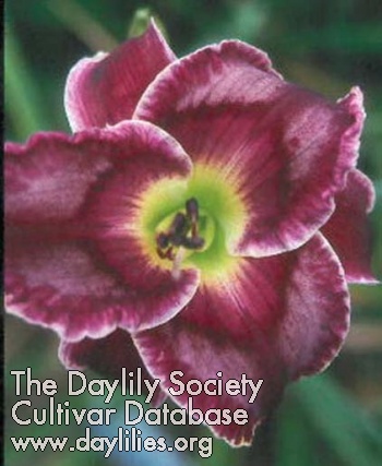 | Description : purple with dark magenta patterned eye and violet sepals with a white edge | |