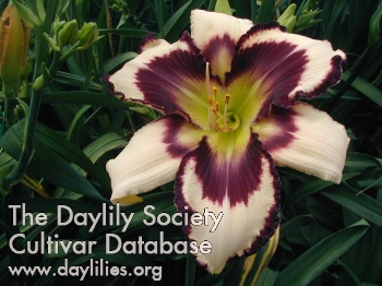 | Description : dark pink lavender with a purple eye and lavender feathers, triple edge of grape, lavender and ivory, green throat | |