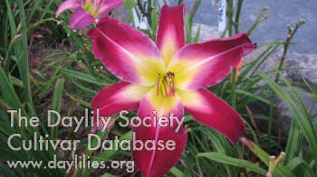 | Description : Dark rose pink with a light slate halo and a wide, lemon yellow throat. | |
