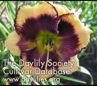 | Description : warm cream base with royal purple and raspberry eye pattern, edged in purple and raspberry above large green throat | |