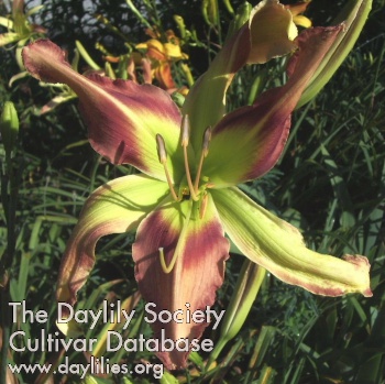 | Description : brick red with creamy gold edge above green extending to creamy golden center throat | |