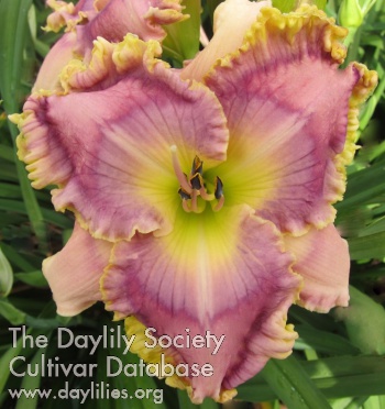 | Description : cream yellow, maroon eye and inner edge, large gold outer edge, green throat | |