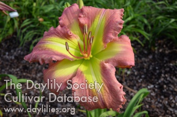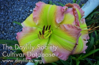 | Description : Neon hot pink magenta, a three inch shamrock green throat with an ice pink bluish watermark, ruffled petals with bubbles on rebloom, diamond dusted. | |
