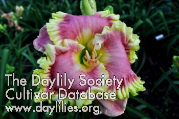 | Description : Pink with coral, large yellow heart, wide, ruffled pink and yellow edge. | |