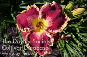 | Description : True red, ruffled yellow edge, celery green throat, and very heavy substance. | |