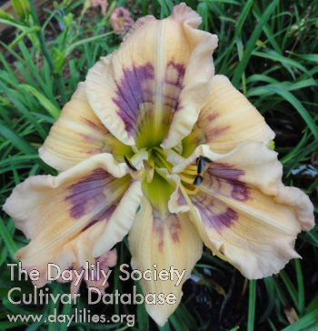 | Description : cream pink with multibanded eyezone of purple and white on both petals and sepals, up to twelve rings of color on eyezone, green throat extends onto petals and sepals | |
