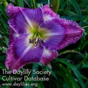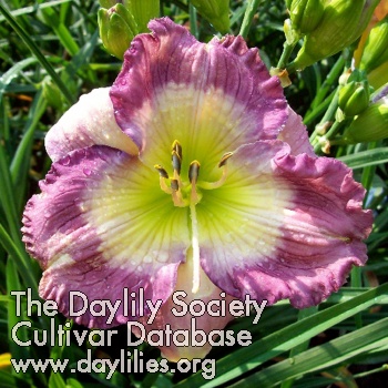 | Description : Creamy white with a patterned blue, violet, and maroon eyezone with matching edge, very intense green throat. | |