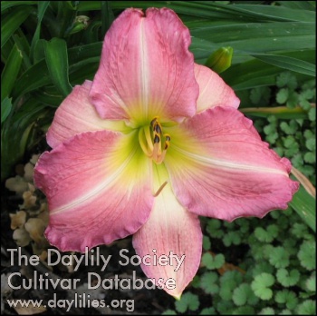 | Description : clear bright pink self with light green throat | |