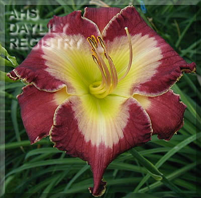 | Description : Maroon purple with a lighter purple white watermark, green throat, and white toothy edge. | |