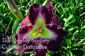| Description : Near black rich purple with a sky lilac watermark, ruffled double edge of lilac and lemon yellow with a large green throat. | |