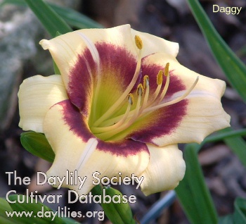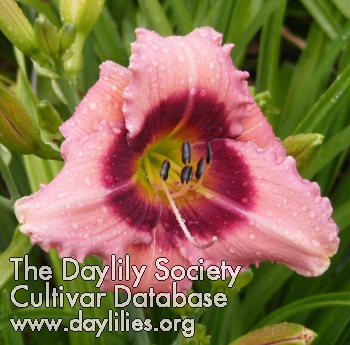 | Description : yellow with purple eyezone above a green throat | |