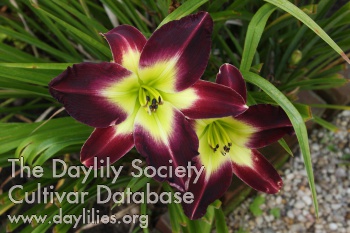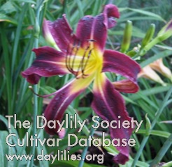 | Description : Dark velvet burgundy with wide chartreuse throat. | |