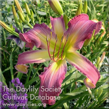| Description : Deep rose pink with lighter pink ruffled edges and watermark, light green throat. | |