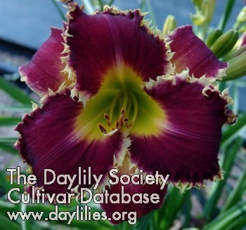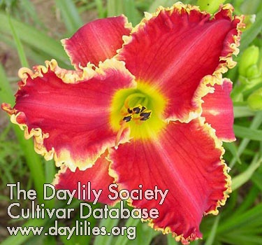 | Description : Garnet red, green heart and orange throat, golden, serrated border. | |