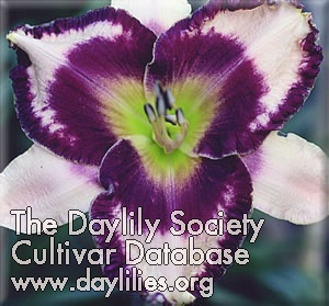| Description : peach with a large wine rose lightly feathered eye, narrow wine rose edge on the petals fading to a gold rim, some ruffling, green throat fading to yellow and then melding to gold and rose, EMO | |